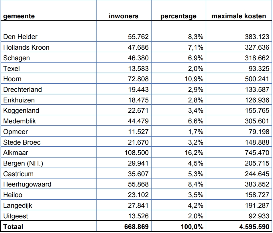 Overzicht van de totale maximale kosten van de 18 gemeenten: