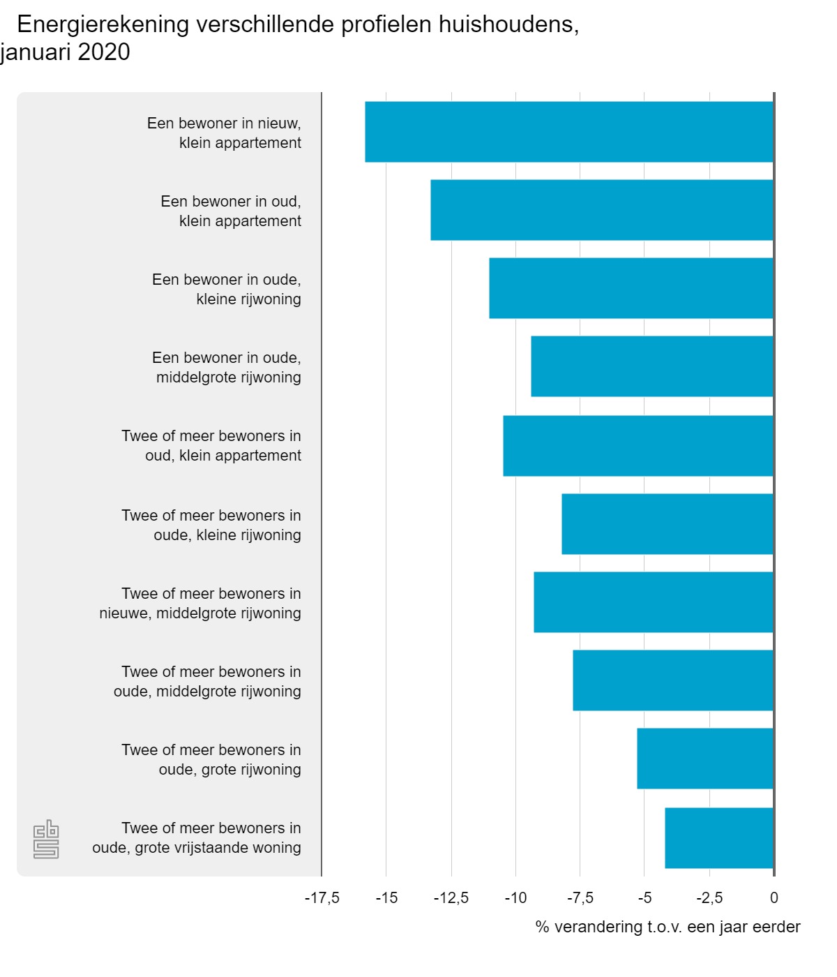 Huishoudens met een lager energieverbruik gaan er in januari 2020 meer op vooruit ten opzichte van januari 2019 dan huishoudens met een hoger verbruik. Zo gaat een eenpersoonshuishouden in klein, nieuw appartement gemiddeld 16 procent (180 euro) minder betalen, terwijl een meerpersoonshuishouden in een grote, oude, vrijstaande woning 4 procent (140 euro) minder gaat betalen. Dit komt doordat iedereen, ongeacht verbruik, dezelfde hogere heffingskorting krijgt: 216 euro. Dit vaste voordeel werkt minder door naarmate de energierekening hoger is omdat verbruik van gas en elektriciteit zwaarder wordt belast.