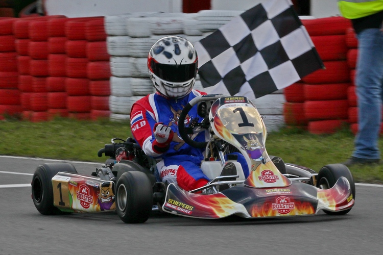 De derde race was daarna een stuk eenvoudiger. Joey vertrok weer vanaf poleposition en hield de leiding voor de rest van de race vast. “Ik heb niet eens hoeven verdedigen.” Nu kan hij zich gaan opmaken voor de laatste NK-ronde voor DD2-rijders, waar hij Nederlands kampioen hoopt te worden. Die ronde wordt pas op 1 oktober op het circuit van Genk gehouden. “De baan ligt me wel. Het zou daar wel goed moeten komen!” Joey Alders wordt in zijn raceactiviteiten ondersteund door Roosted, Schepers Racing Service en Zanardi-kart.