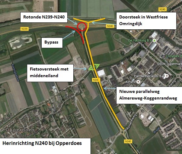 Momenteel is er voor het landbouwverkeer tussen de Almereweg en de Koggenrandweg in de Wieringermeer geen goede verbinding. Dit zorgt er voor dat het landbouwverkeer moet omrijden via Opperdoes of Medemblik. Vanuit de omgeving is er een sterke wens om een oplossing te bedenken voor het landbouwverkeer dat nu door de woonkernen rijdt. Samen met de gemeenten Medemblik, Hollands Kroon en het Waterschap Hollands Noorderkwartier heeft de provincie Noord-Holland besloten om de parallelweg vanaf de Almereweg door te trekken naar de Koggenrandweg. Hiervoor moet een nieuwe doorsteek door de Westfriese Omringdijk gemaakt worden. Daarnaast wordt er op het kruispunt N239-N240 een rotonde aangelegd met een bypass voor het verkeer vanaf de N239 in zuidelijke richting naar de N240. Ter hoogte van het Opperdoezerpad komt een veilige oversteek met een middeneiland. Deze nieuwe situatie ziet er als volgt uit: