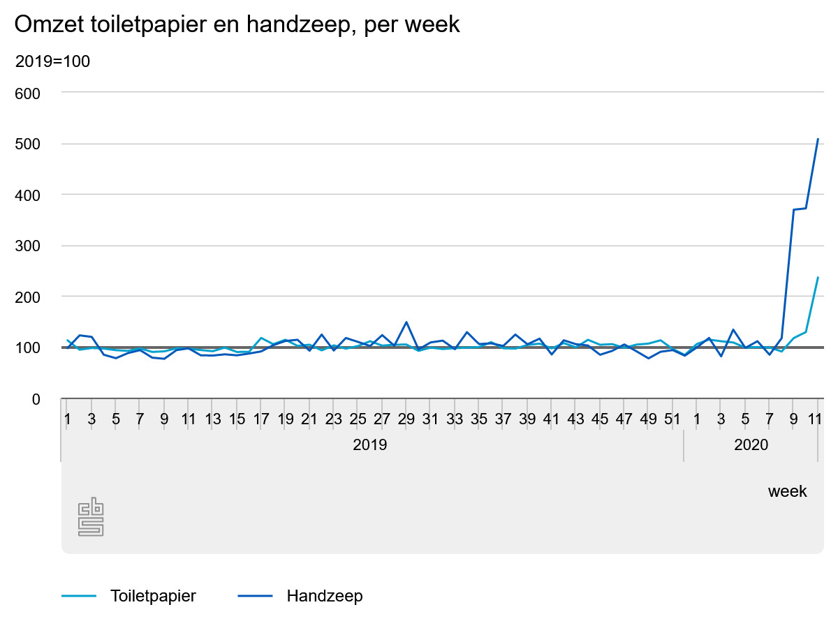 Dat de vraag naar toiletpapier en handzeep toenam is ook terug te zien in de supermarktcijfers. De omzet van handzeep lag vijf keer hoger ten opzichte van dezelfde periode een jaar eerder. Ook in de laatste week van februari en in de eerste week van maart waren er al sterk verhoogde omzetcijfers voor handzeep. De omzet van toiletpapier is in de tweede week van maart ruim verdubbeld in vergelijking met dezelfde week in 2019, terwijl de omzetcijfers voor dit product doorgaans vrij constant zijn.