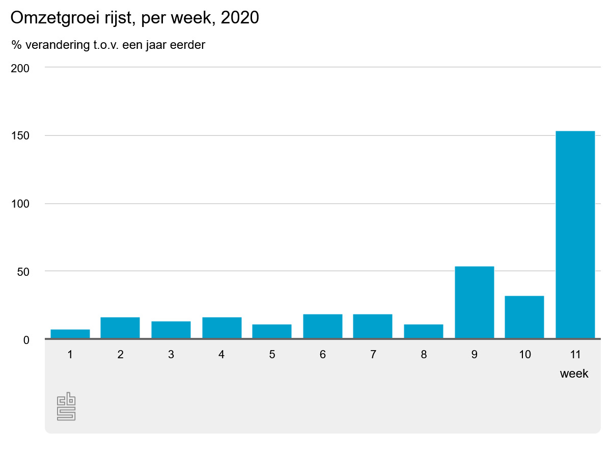 De omzet van rijst nam al vanaf de laatste week van februari toe. In de eerste week van maart vlakte de omzetgroei vervolgens wat af, waarna in de tweede week van maart een stevige groei van de omzet wordt gemeten.