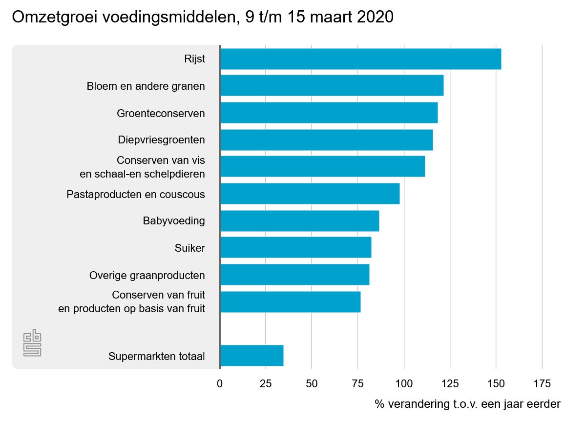 Vooral de omzet van houdbare producten, zoals conserven, diepvriesgroenten, rijst en pasta nam procentueel gezien sterk toe. De omzettoename van rijst was van alle voedingsmiddelen met ruim 150 procent het grootst, de omzet was dus meer dan twee en half keer zo hoog.