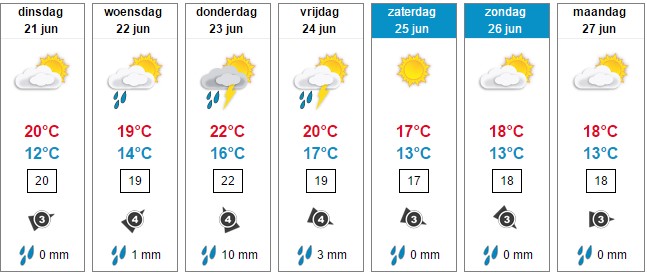 De komende dagen wordt het geleidelijk zonniger en is het wisselvallig in Hollands Kroon. Overdag wordt het ongeveer 19 °C en ’s nachts blijft de temperatuur rond 15 °C. De wind draait geleidelijk naar het westen en is matig, windkracht 4. Na het weekend neemt de kans op neerslag weer af.