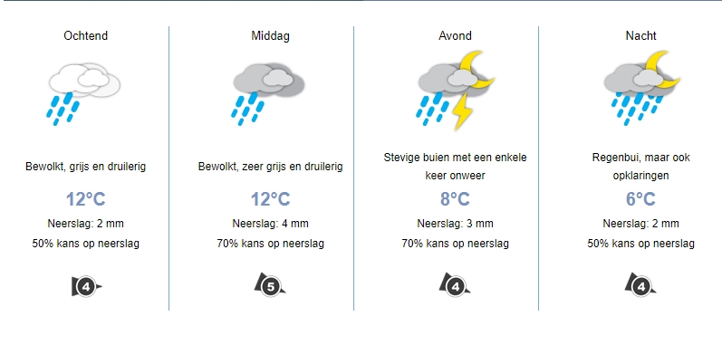 Vandaag hebben wij te maken met buien waarvan sommige zelfs gepaard gaan met een klap onweer en de vrij krachtige en tijdens buien krachtige westelijk/noordwestelijke wind zorgt er voor dat het vanmiddag niet veel warmer dan een graad of 12 gaat worden, en tijdens een bui zelfs onder de 10 graden gaat duiken. In de nacht naar zaterdag daalt het kwik naar een graad of 6.