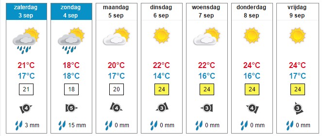 De komende dagen wordt het geleidelijk zonniger en neemt de kans op regen af in Hollands Kroon. De temperatuur stijgt tot 22 °C overdag, ’s nachts is het ongeveer 16 °C. De wind draait geleidelijk naar het noordoosten en is matig, windkracht 4. Vanaf woensdag neemt de kans op neerslag af.
