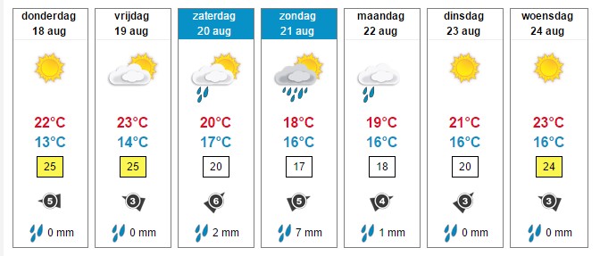 De komende dagen zijn er opklaringen en neemt de kans op regen toe in Hollands Kroon. De temperatuur daalt tot 18 °C overdag, ’s nachts is het ongeveer 16 °C. De wind draait geleidelijk naar het westen en is vrij krachtig, windkracht 5. Na het weekend neemt de kans op neerslag weer af en wordt het overdag warmer met temperaturen rond 24 °C.