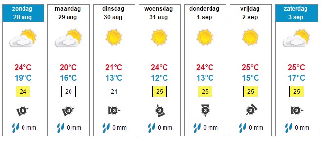 De komende dagen wordt het geleidelijk zonniger en blijft het droog in Wieringerwaard. De temperatuur stijgt tot 25 °C overdag, ’s nachts is het ongeveer 15 °C. De wind draait geleidelijk naar het oosten en is matig, windkracht 3. In het weekend wordt het overdag kouder met temperaturen rond 20 °C.