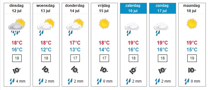 De komende dagen zijn er opklaringen en is de kans op regen hoog in Hollands Kroon. Het is 18 °C overdag en de temperatuur ’s nachts stijgt tot 16 °C. De wind is matig, windkracht 4. Na het weekend neemt de kans op neerslag af en wordt het overdag warmer met temperaturen rond 20 °C.